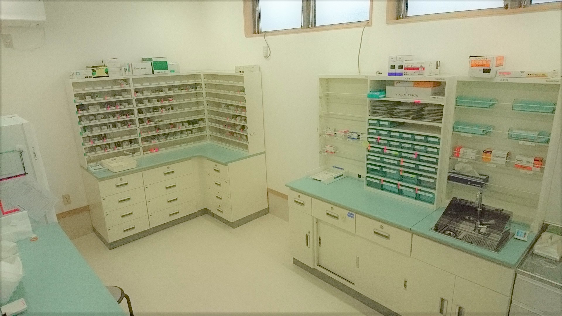 街かどのクリニックは「院内処方」です。お会計の際にお薬をお渡しできます。また通常の「診療所の支払+調剤薬局の支払」よりも安価ですので、医療費削減にも貢献でき患者さまに大変喜ばれています。その院内の薬局が下の写真です。